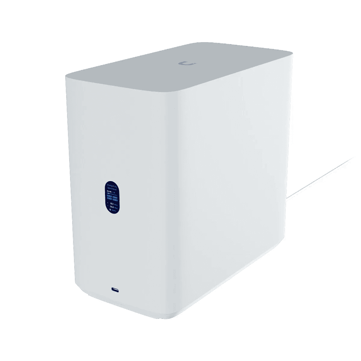 UniFi Network Attached Storage with (4) 2.5/3.5" HDD bays, (2) M.2 NVMe SSD cache slots, 2.5 GbE networking, USB-C connectivity, and an included PoE+++ adapter, all in a compact footprint.